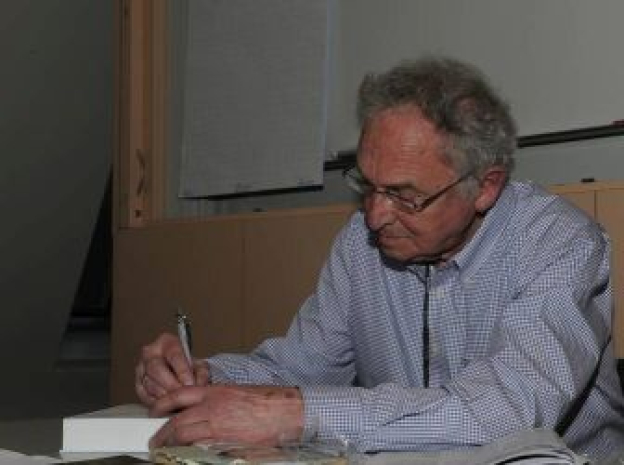 Jan Buisman signeert een pas verschenen boek. Foto: Leo Wouters